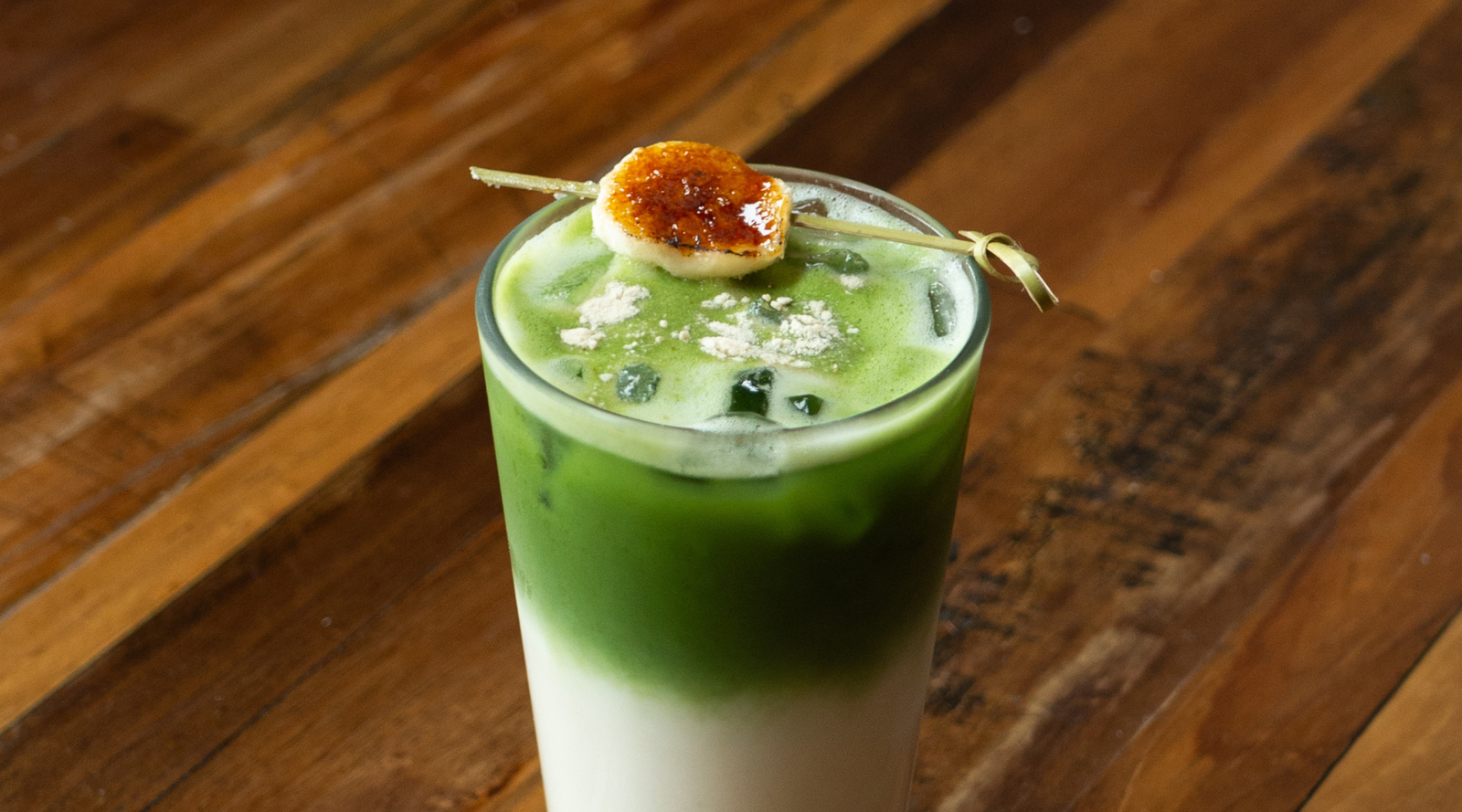 Start by adding your syrup to a glass, then the milk, ice (also works as a hot matcha latte) and top with your prepared matcha. Garnish with a tasty brûléed banana slice.