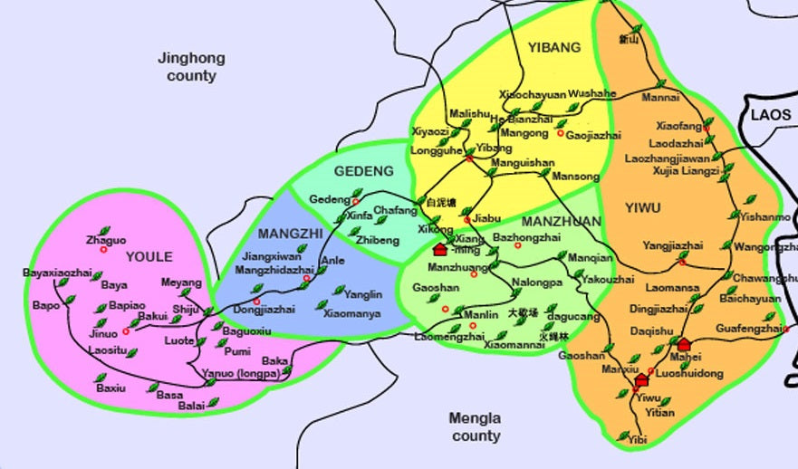 Cutting right down the middle is the Lancang river, which divides two sets of “famous” tea mountains (among the many dozens). On the east, you have the 6 “old” mountains. They are: